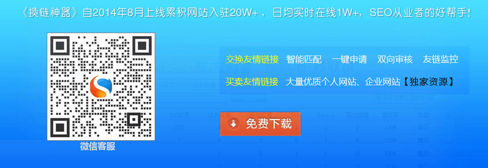 換鏈神器是一款站長友情鏈接交換的客戶端,目前擁有近十萬有效網站資源,日均在線友情鏈接交換網站近3萬余家;是目前中文活躍的友情鏈接平臺。